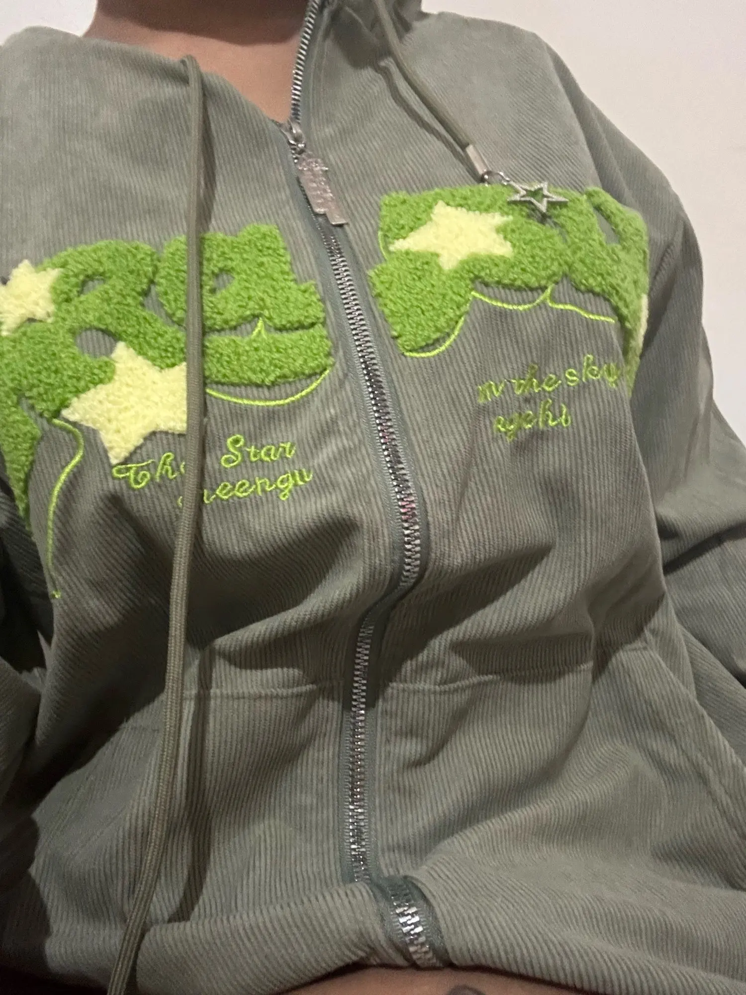 Really thin with small lettering. Not as good as the pictures make it seem, but it's still comfy and kinda cute.