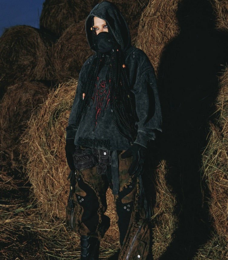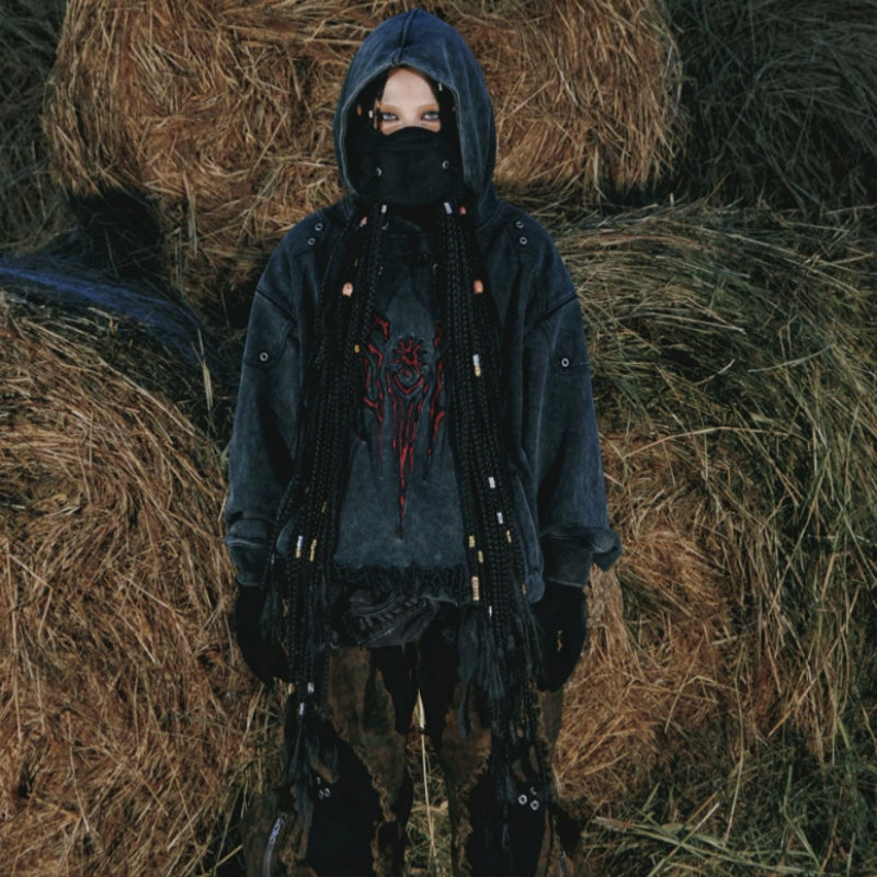 Tribal 3D Embroidered Washed Distressed Hoodie Heavy Weight Gray Sweatshirt